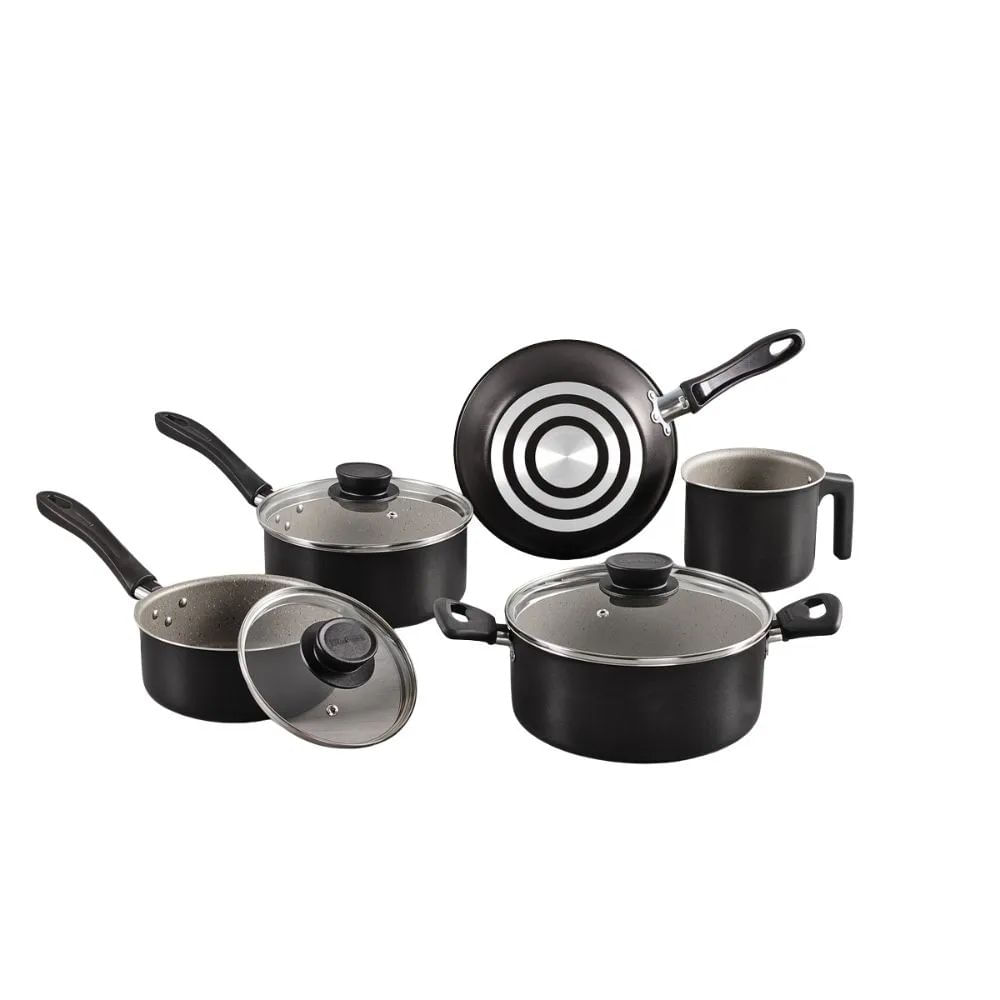 Aprimore sua cozinha com o jogo de panelas Tramontina Linz em alumínio com revestimento interno e externo em antiaderente Starflon Max preto 5 peças.