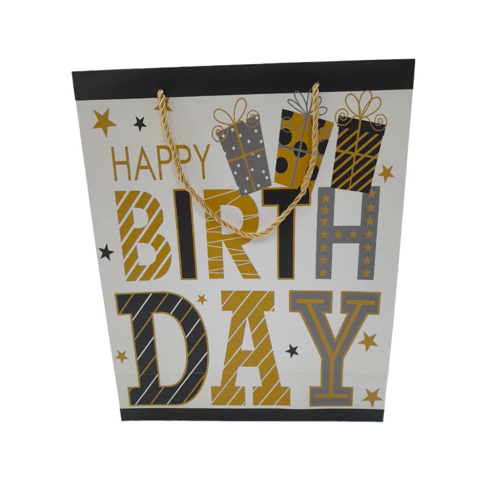 Sofisticação e estilo para celebrar em grande estilo com nossa sacola de presente tema aniversário nas cores preto, cinza e dourado.